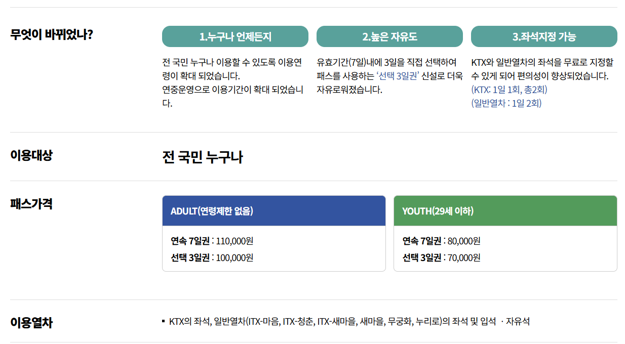 - KTX 좌석 지정: 하루 1회만 가능하며, 패스 기간 전체 통틀어 총 2회까지만 허용됩니다. (가장 긴 구간에 사용하세요!)