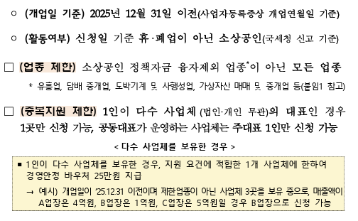 - 업력 요건: 2025년 12월 31일 이전 개업하여 신청일 현재 정상 영업 중이어야 함 (폐업자 제외)