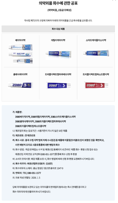 🔍 1. 2080 치약 회수(리콜) 사태란?