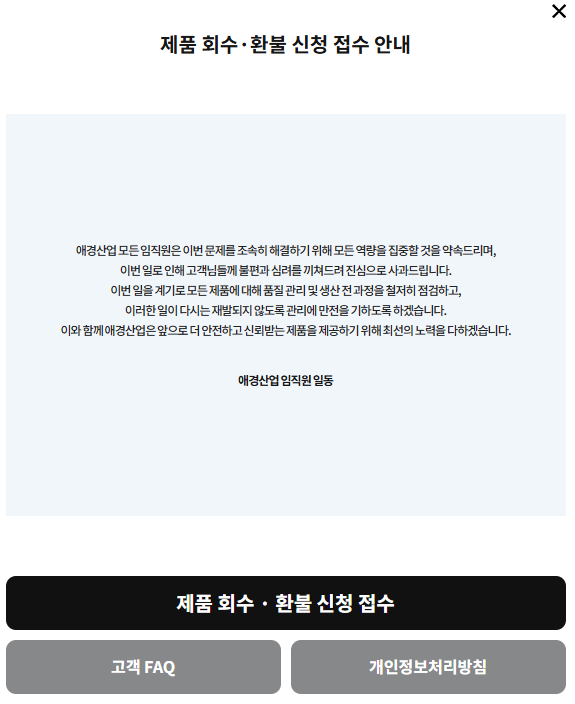 애경산업은 “제품 안전을 최우선으로 고려하여 회수를 결정했다”고 공식 발표했고, 소비자 피해를 최소화하기 위해 전량 회수 및 환불 조치를 시행하고 있습니다.